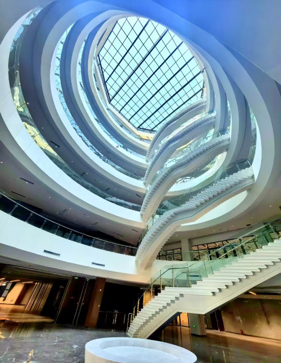 踏入图书馆正门,首先映入眼帘的是宽敞明亮、布局合理的大厅。柔和的灯光均匀地洒落在地面上,与穿过玻璃幕顶的阳光相互映衬,让整个空间既温馨又充满现代感。大厅中央,一座曲线流畅、灵动飘逸的圆弧楼梯出现在眼前,极具视觉冲击力,设计灵感来自“书山有路勤为径”这一古训。