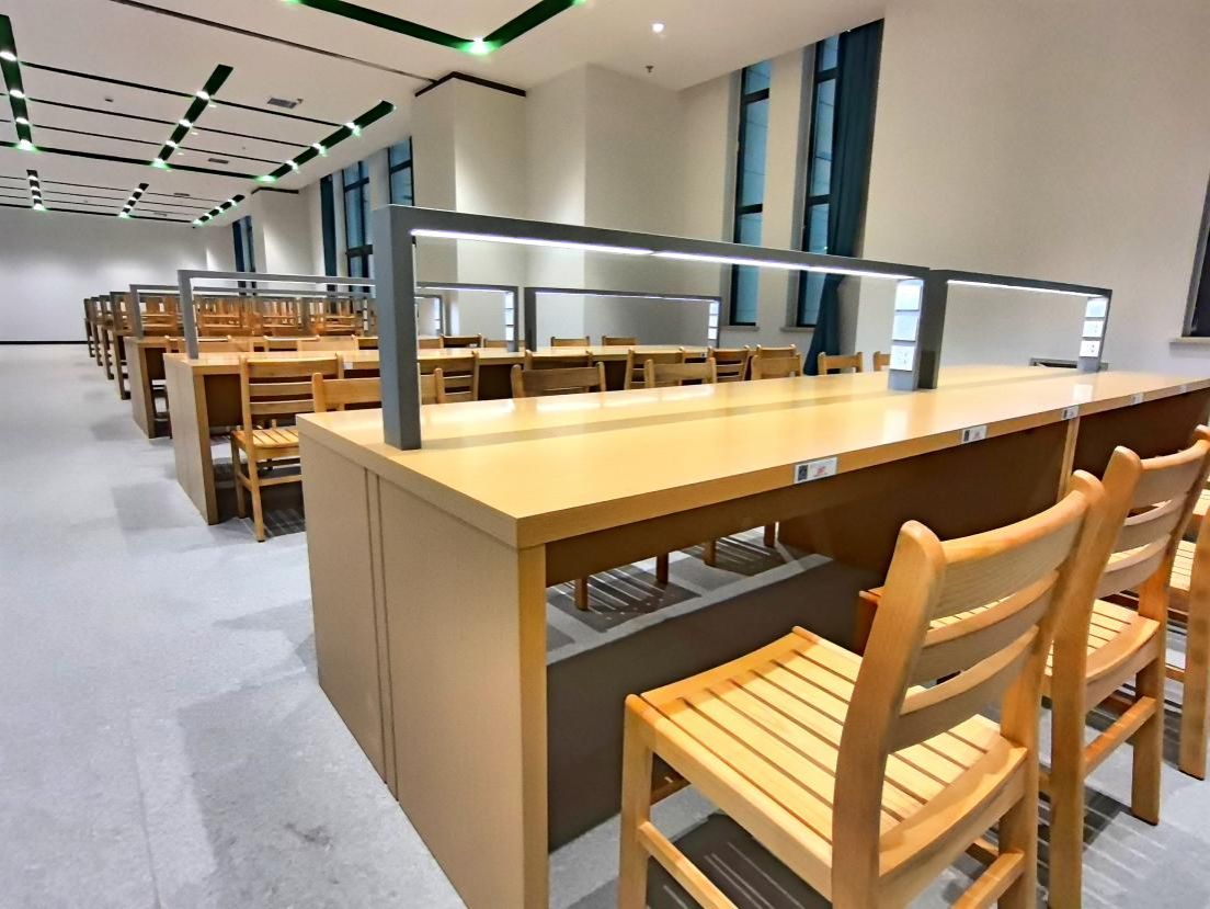 阅览区,整齐美观且舒适的桌椅映入眼帘。桌椅位置在施工时提前预留好了各式电源,既美观又充分满足了读者使用电子设备的需求。