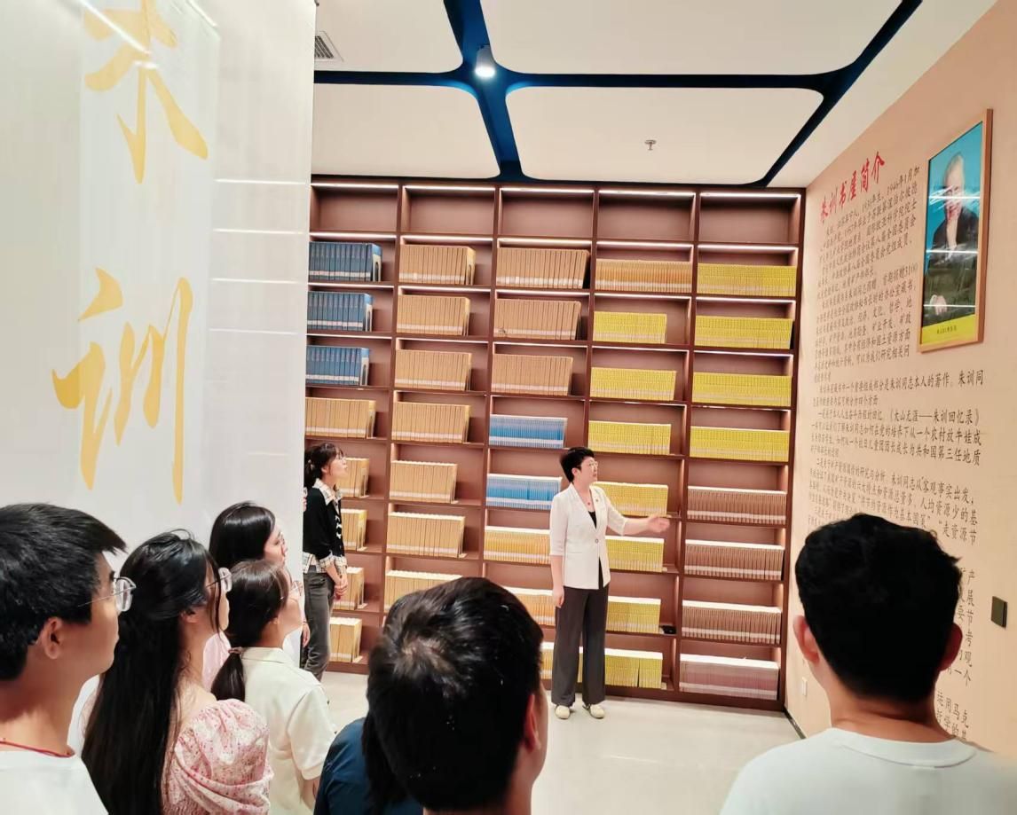 接着,图书馆馆长郭雅洁引领同学们走进了朱训书屋。她详细介绍了原地矿部部长朱训先生的平生以及先生向我校慷慨捐赠的珍贵藏书、本人四个方面的著作。每一册书都承载着朱训先生的智慧与情怀,它们静静地躺在书架上,等待着同学们去翻阅、去领悟。