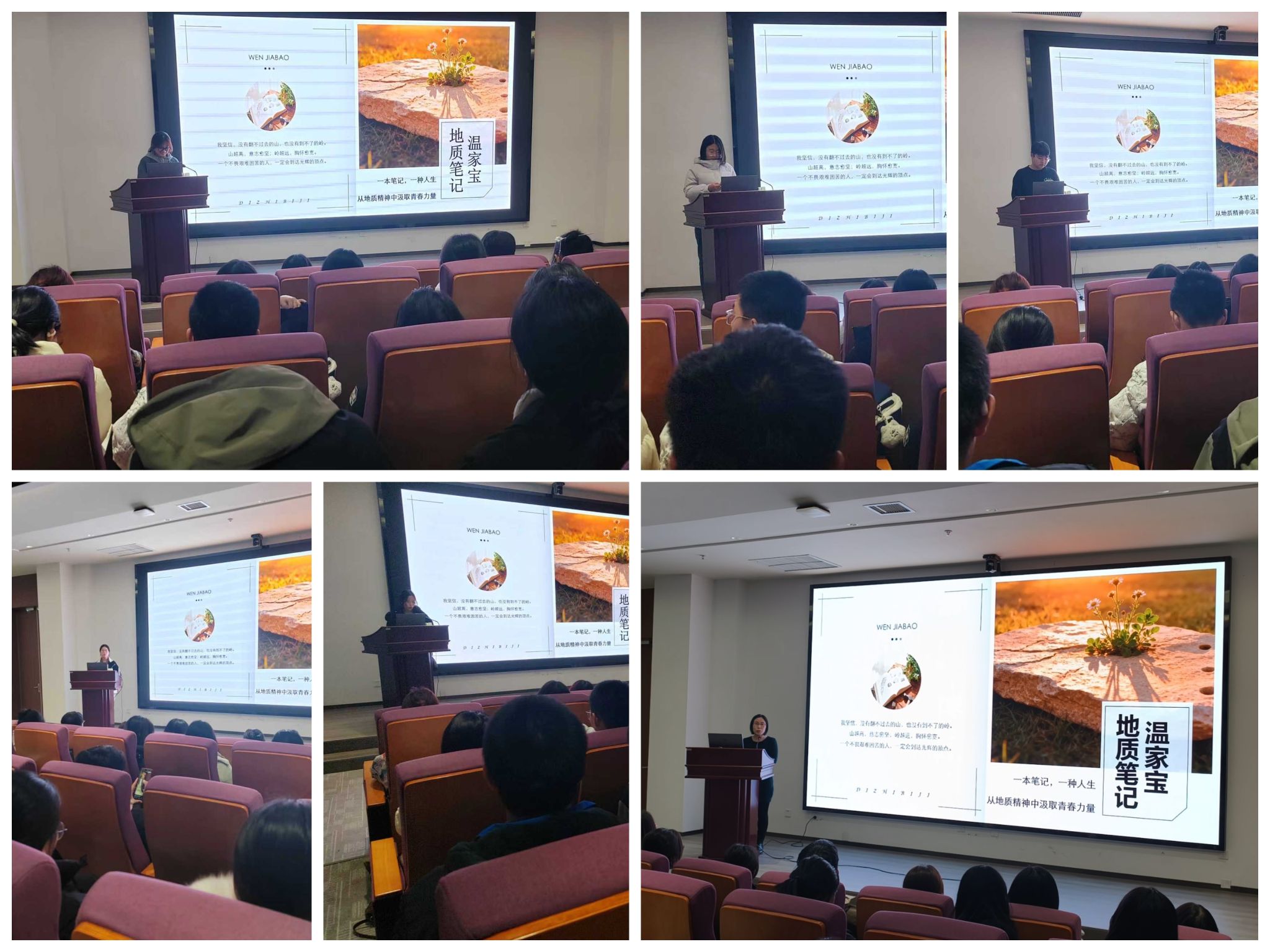 图书馆举办了形式多样、内容丰富的阅读方式,带领同学们阅读此书。第一期读书活动——“书屋中的地质精神”读书会为同学们开启了一扇理解地质科学、地质人与地质精神的大门。第二期读书活动——党建书屋读书会上,莘莘学子们被温家宝同志那段充满理想与激情的光辉岁月深深触动,深刻体会到前辈们将个人理想融入国家发展的责任与担当。在11月13日开始举办的阅读分享活动中,贾素娜老师带领200多名同学共读《温家宝地质笔记》,大家围绕温家宝同志对地质工作的严谨态度和科学精神、个人成长与品格塑造、家国情怀等主题撰写心得体会,畅谈如何将书中求真务实的科学态度、不畏艰难的意志品质以及家国情怀转化为成长的内生动力。