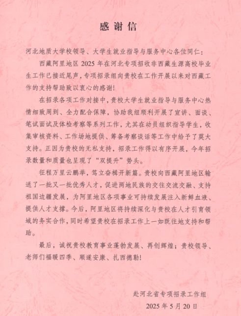 5月20日,西藏阿里地区专项招录工作组向我校发来感谢信,向taptap下载校领导、大学生就业指导与服务中心在西藏阿里地区专项招录工作中提供的支持帮助致以衷心的感谢。