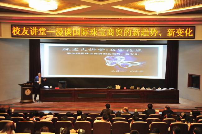 於晓晋教授的报告以戴比尔斯这一国际钻石巨头公司的成立与发展为开篇,阐述了钻石市场的发展与变化;以红宝石与坦桑石等不同的彩色宝石为典例,介绍分析了彩色宝石市场前景与存在的问题;以白玉为例,就玉石行业整体现状谈了自己的独到见解,引人入胜。於教授谈到微商市场时,与在场同学们积极互动,认真回答了大家提出的问题。报告在热烈的掌声中结束。