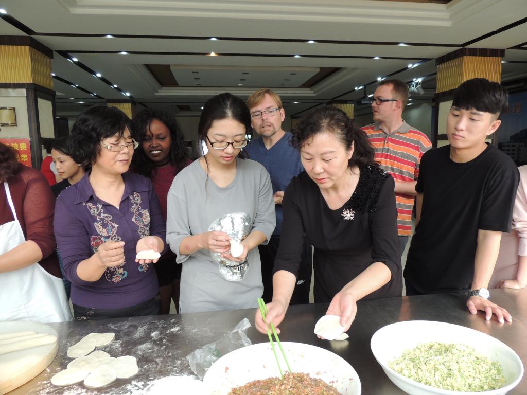 活动初始,惠馨园的厨师向大家逐步展示了饺子皮和馅的前期制作过程,而后鼓励各位外籍朋友们动起手来一起包饺子。在中方教师的亲自指导以及相关人员的帮助下,学生们纷纷由无从下手转而渐渐包得有模有样。大家一起边学边做,包出的饺子虽形状各异,却满载了全体外籍师生们对中国传统文化浓厚的兴趣。