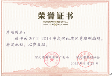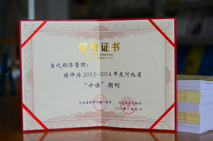 2015年,河北省新闻出版广电局、河北省期刊协会组织开展了2012—2014年度河北省优秀期刊、优秀期刊管理人员、优秀期刊编辑评选。近日,河北省新闻出版广电局、河北省期刊协会向各获奖单位和个人颁发了证书。我校主办的《当代经济管理》荣获河北省“十佳”期刊荣誉称号,当代经济管理编辑部李萌同志被评为2012—2014年度河北省优秀期刊编辑。