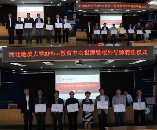 在全场热烈的掌声中,毛磊和导师代表魏卓民(河北省信息产业投资集团党委书记、董事长)共同为我校MPAcc教育中心揭牌。随后,毛磊为校外导师颁发了聘书,与全体受聘导师合影留念。
